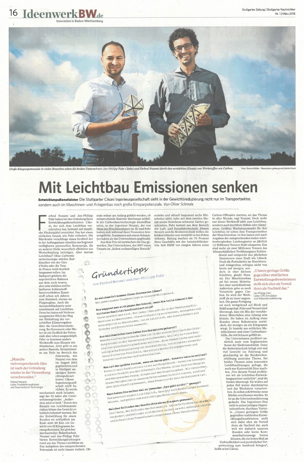 Und mitten drin: die Stuttgart CIKONI Ingenieurgesellschaft. Mit Leichtbau Emissionen senken ist das Ziel. CIKONI sieht in der Gewichtsreduzierung nicht nur im Transportsektor, sondern auch im Maschinen- und Anlagenbau noch große Einsparpotenziale. CIKONI ist ein spezialisiertes Ingenieurbüro für innovative Leichtbau- und Faserverbundlösungen mit Sitz in Stuttgart. Das Unternehmen entwickelt für seine Kunden Leichtbauprodukte aus faserverstärkten Hochleistungsverbundwerkstoffen, mit additiver Fertigung oder in Hybridbauweise.