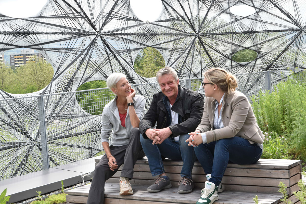 Im TEXOVERSUM informierte sich die 52-jährige über die Angebote vor Ort – die Aus- und Weiterbildungsangebote der TEXOVERSUM Experts & Training Hub gGmbH, die vielfältigen Studiengänge der TEXOVERSUM Fakultät Textil und wie sowohl Auszubildende als auch Studierende das Thema Nachhaltigkeit vermittelt bekommen und in Projekten eigenständig daran arbeiten. Im Technikum der TEXOVERSUM Fakultät Textil zeigten Studierende auch praktisch, wie beispielsweise die Nassvliestechnologie, Naturfasern oder biobasierten Materialien zu einer nachhaltigeren Textilproduktion beitragen können. Zum Abschluss ihres Besuchs tauchte Martina Gleissenebner-Teskey in die Kollektion des studentisch geführten Modelabels RU Enterprises ein. Sie präsentierte die TEXOVERSUM Capsule Collection vor der futuristischen Fassade aus Glas- und Carbonfasern und Kleidungsstücke von Studentin Eleonora Fay aus Vintage Handtüchern im textilen Interieur des Gebäudes. So fanden zum Abschluss des Tages Ausbildung, Technologie, Innovation, Nachhaltigkeit und Kreation zu einer Symbiose zusammen.