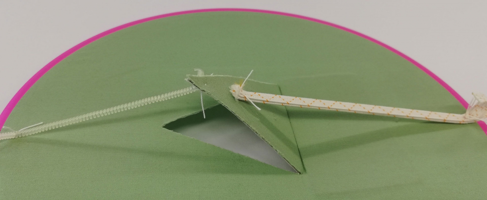 Das Funktionsmuster des Sonnensegels mit variabler Beschattung (Abbildung 2) verwendet einen passiven Muskel als Aktor, welcher die Beschattung regulieren kann. Durch einen Gummizug (rechts) wird die Klappe aufgestellt und der Muskel (links) unter Spannung gesetzt. Das Licht kann jetzt durch die Öffnung scheinen. Bei größerer Wärmeentwicklung zieht sich der textile Muskel zusammen und schließt die Klappe. Die Abschattung durch das Sonnensegel wird vergrößert. Kühlt der Muskel ab, längt er sich wieder und die Klappe öffnet sich.