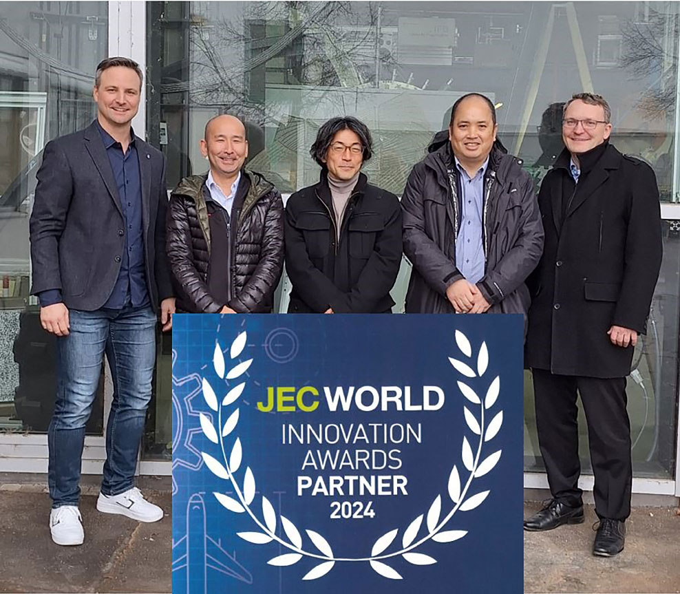 Sehr stolz ist Tajima dieses Jahr darauf, dass Kollegen aus Japan zusammen mit dem Entwicklungspartner Toyota einen JEC Award gewinnen konnten: Er wurde Ihnen zu einem TFP-Monocoque Bauteil verliehen, das sowohl Bereiche aus klassischem Aluminium, als auch Faserverbundstrukturen enthält und im Verhältnis zum vorherigen reinen Alubauteil deutlich Gewicht spart. Die Gewinner konnten am Tag nach der Preisverleihung in Stuttgart empfangen werden (Bild JEC).