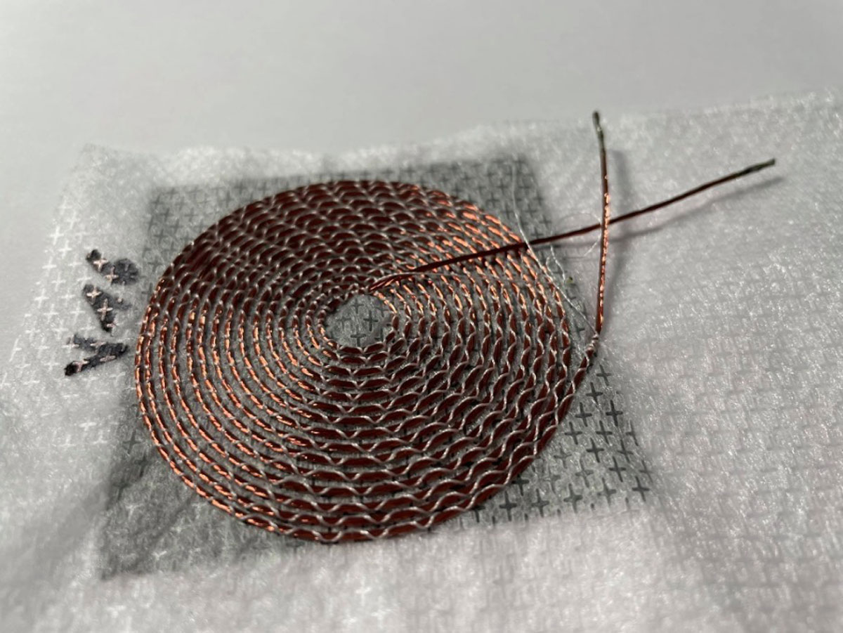 Zuerst wurde ein Konzept für das Funktionsmuster erstellt. Das Induktive Laden soll mittels einer aus Kupferlitzendraht gestickten Spule (Abb. 2) und einer unterstützenden Ferritfolie (Abb. 3) ermöglicht werden. Die Aufbewahrungstasche der Ladeeinheit wird dann aus elastischem Stoff gefertigt (Abb.5). Alle Komponenten werden in einem Produkt fusioniert (Abb.1 und 6). Dieses ist integrierbar auf jeder textilen Fläche.