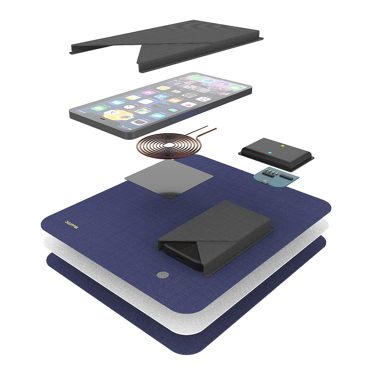 Der Grundgedanke für das Projekt war, dass Menschen immer mehr Zeit an ihren Smartphones verbringen. Für den Ladevorgang unterwegs müssen schwere Powerbanks und Ladekabel mit verschiedenen Anschlüssen mitgenommen werden. Induktives Laden und die Integrierbarkeit einer Ladestation in einem Textilstück ist die Lösung der Zukunft (Abb. 1).