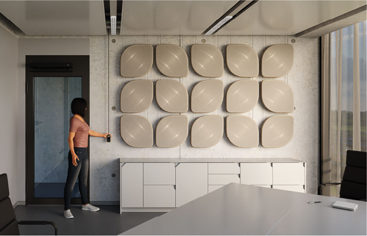 Die praktische Umsetzung der AMBILOOM® Acoustics-Module ist ein Paradebeispiel für die Verbindung von innovativer Technik und praktischer Anwendbarkeit. Die äußere Form der Schallabsorber wird durch ein Aluminium-Skelettmodell gebildet, das mit dem ETTLIN DecoLux-Gewebe bespannt ist. Dieses Gewebe sorgt nicht nur für die charakteristische Lichtbrechung, sondern trägt auch zur Schallabsorption bei.