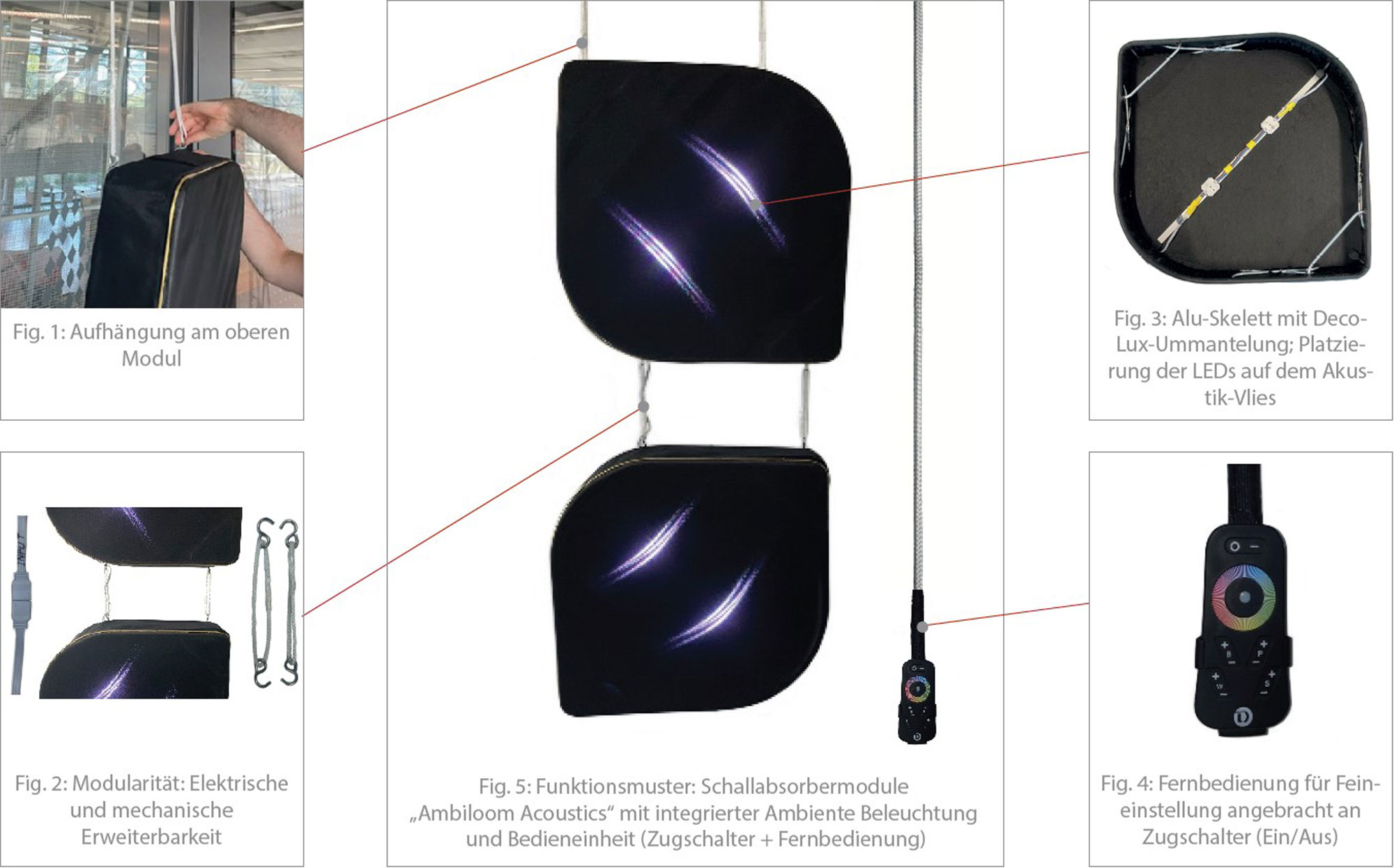 Zur Steuerung des Systems wird eine Fernbedienung verwendet, die eine komfortable Anpassung der Beleuchtung und der Akustik ermöglicht. Ein Zugschalter sorgt für das Ein- und Ausschalten der Absorber, was eine benutzerfreundliche Handhabung gewährleistet.