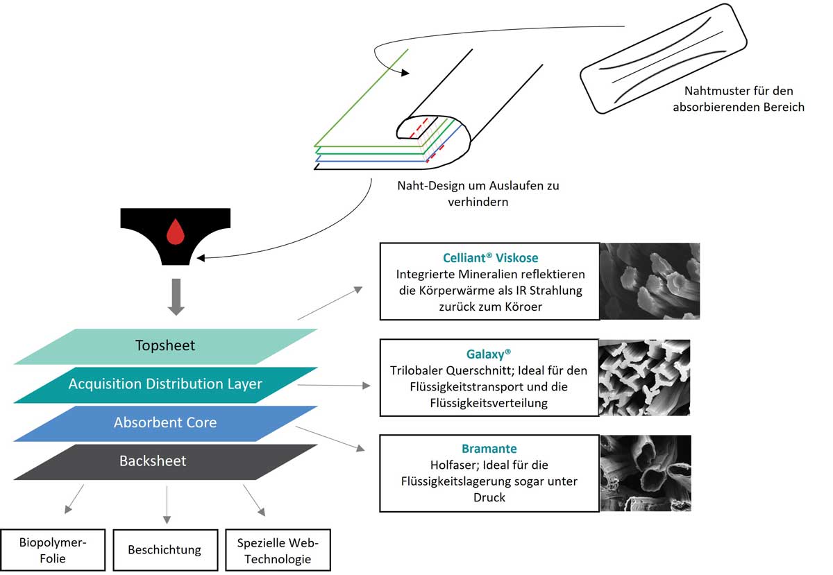 In den verschiedenen Lagen des Periodenslips werden unterschiedliche Spezialviskosefasern verwendet, die speziell auf das Anforderungsprofil absorbierender Hygieneprodukte zugeschnitten sind. Außerdem wurde ein spezielles Nahtdesign entwickelt, welches keine durchgängige Naht verwendet und somit einen höheren Schutz vor dem Auslaufen bietet.
