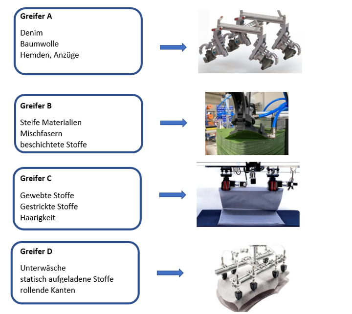Robotextile hat auf Grundlage jahrzehntelanger Erfahrung in der Roboter Integration und Handhabung biegeschlaffer Teile vier neue Greifer Methoden entwickelt (und zu Patenten angemeldet), die in der Lage sind, nahezu alle gängigen Textilien und Stoffe sicher zu greifen und sehr genau wieder abzulegen. Hierbei können Einzellagen genauso genommen werden, wie die oberste Lage vom Zuschnitt Bündel.
