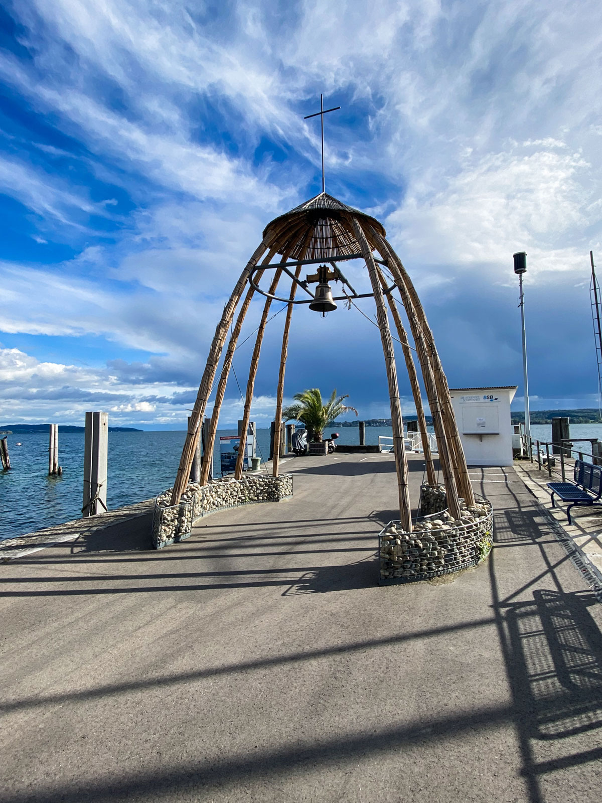 Pandemiebedingt fand die geplante Landesgartenschau 2020 am Bodensee erst in diesem Jahr statt. Für diese Veranstaltung haben wir in Zusammenarbeit mit der Baukunstgruppe Sanfte Strukturen einen filigranen Glockenturm errichtet. Wir zeichnen hier verantwortlich für die Statik des Turms, der auf dem Steg der Anlegestelle Überlingen West direkt neben dem Kirchenschiff aufgestellt wurde. Es musste sichergestellt werden, dass das Bauwerk die anfallenden Lasten in Form von Glockenlast, Nutzlast und Windlast sicher aufnehmen kann. Nahezu ein halbes Jahr konnte der Glockenturm neben verschiedenen Parkanlagen, Gärten und Pavillons bestaunt werden.