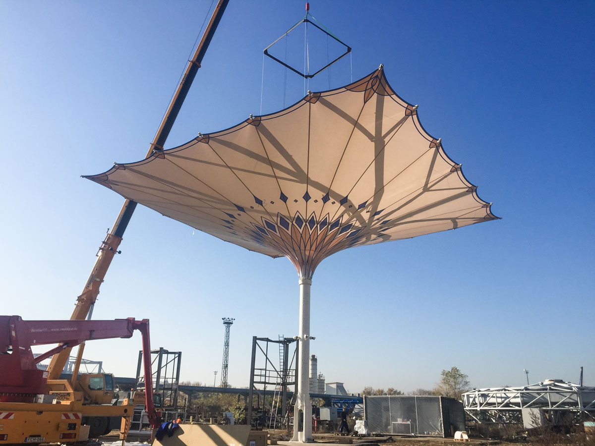 Im Bereich Leichtbaustrukturen konnten wir in der Disziplin tätig sein, für die wir am bekanntesten sind: die Planung von 36 Schirmen als wandelbares Schattendach. Die Testinstallation für die Schirmreihe im Rahmen der sogenannten Nullserie fand im November diesen Jahres auf dem Gelände einer unserer Hersteller statt. Die Nullserie dient zu Erprobungszwecken und zur Evaluierung des Fertigungsprozesses vor der finalen Produktion aller Schirme. Hierbei wurde die faltbare Stahlrahmenkonstruktion mit der Teflon-Gewebsmembran mit einer Spannweite von 24 Metern aus 100% PTFE installiert. Sie reflektiert mehr als 70% der Sonneneinstrahlung und verbessert somit auf ästhetische Weise das Klima des Innenhofes einer Moschee. In Summe werden die Schirme insgesamt eine Fläche von ca. 11.000m² verschatten.