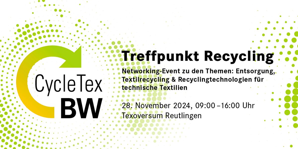 Im Rahmen von CycleTex BW veranstaltet AFBW am 28. November 2024 das Networking-Event „Treffpunkt Recycling“. Mit der Veranstaltung adressiert die AFBW eine der wichtigsten Themenstellungen des Projekts: Einmal verwendete Ressourcen und Materialien sollen so lange wie möglich erhalten werden. Dabei hat CycleTex BW vor allem pre-consumer Produktionsreste technischer Textilien im Blick.