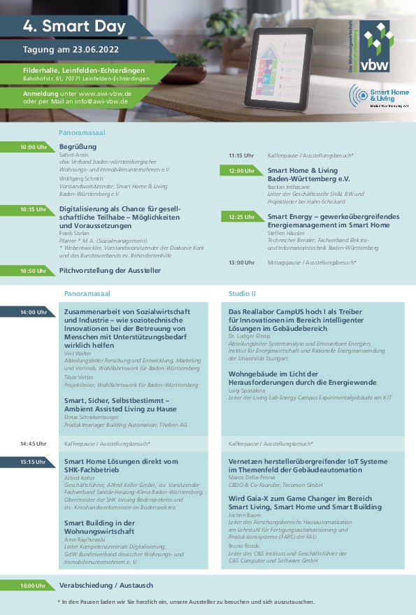 Der Verein Smart Home & Living Baden-Württemberg e.V. veranstaltet in Kooperation mit dem vbw Verband baden-württembergischer Wohnungs- und Immobilienunternehmen e.V. die jährliche Fachtagung Smart Day.