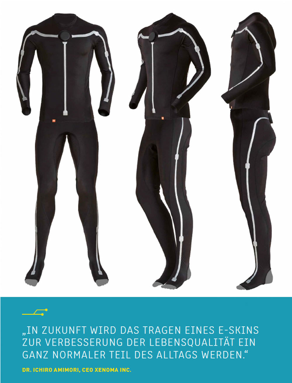 Das Produkt e-skin MEVA von Xenoma aus Tokio in Zusammenarbeit mit Sci-Track und dem Deutschen Forschungszentrum für Künstliche Intelligenz GmbH (DFKI) ermöglicht eine intelligente, hochwertige Erfassung von Körperbewegungen ohne den Einsatz von Kameras oder Markern. Das System besteht aus sensorischen Bekleidungsteilen (Hose, Shirt, Kopfband) und einer Software zur Auswertung der Messdaten in Echtzeit. Die Bewegungserfassung funktioniert komplett kabellos über eine Vielzahl integrierter, dehnbarer Inertialsensoren. Hierbei müssen keinerlei Magnetfeldmessungen verwendet werden. In nur 30 Sekunden ist das System einsatzbereit, ohne dass professionelle Unterstützung benötigt wird.