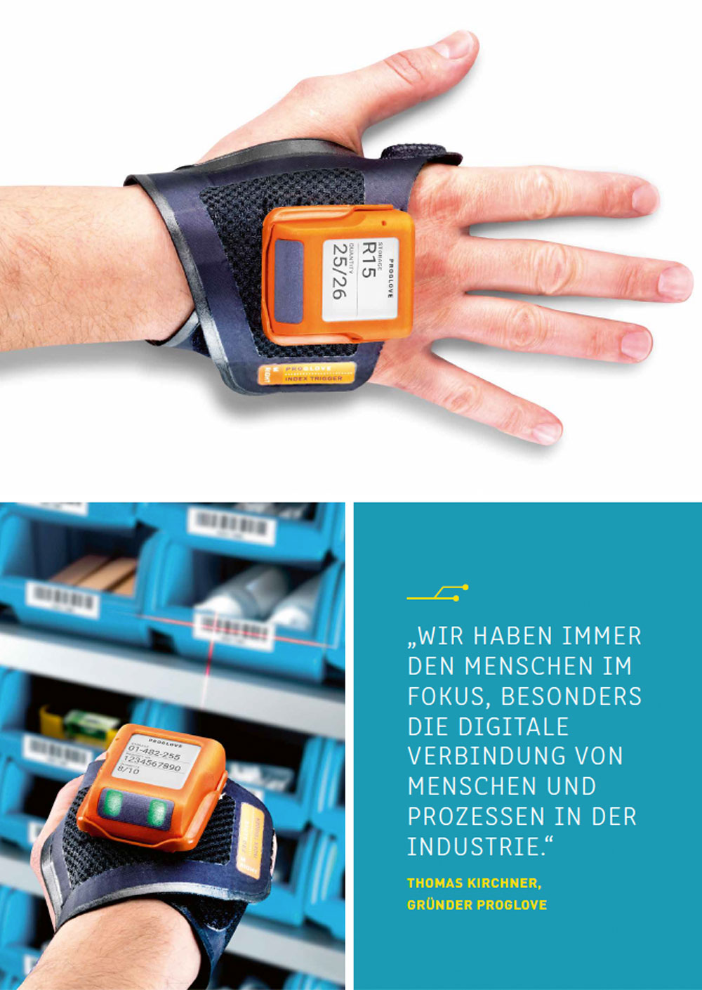 Das Münchner Unternehmen ProGlove bringt den Scanner auf den Hand- rücken. So kann dieser durchgängig an einer Manschette getragen werden. Er soll das schnelle und einfache Scannen von Barcodes ermöglichen, um Prozessschritte zu dokumentieren und den Weg eines Produktes durch die Lieferkette zurückverfolgen zu können. Darüber hinaus kann der Scanner in Echtzeit ein bestätigendes oder berichtigendes Feedback geben und die Daten automatisch in einen Kontext setzen und übertragen. Ein textiler Auslöser an unterschiedlichen Positionen der smarten Produkte ermöglicht den bedarfsgerechten Einsatz in vielen Aufgabengebieten.