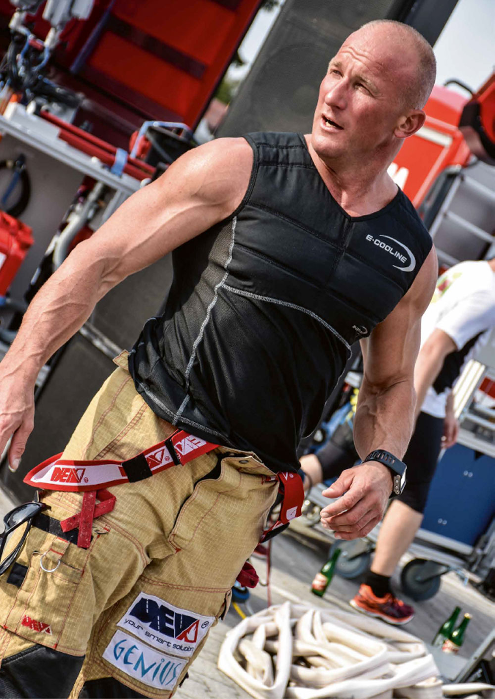 Das Unternehmen pervormance international GmbH bietet unter der Marke E.COOLINE® aktiv kühlende Funktionstextilien wie T-Shirts, Westen und Mützen an. Dafür setzt das Unternehmen das Hightech- Vlies COOLINE SX3 ein. Das 3D-Material hat die Eigenschaft, Wasser sekundenschnell im Innern zu binden und direkt auf den Vliesfasern fest zu speichern. So entsteht eine große Oberfläche an Wassermolekülen, die aktiv kühlt. Aktiviert wird das Prinzip, indem man von vorne und hinten gleichmäßig Wasser über den wattierten Teil des Produktes laufen lässt oder das Produkt kurz in einem Wasserbecken tränkt.