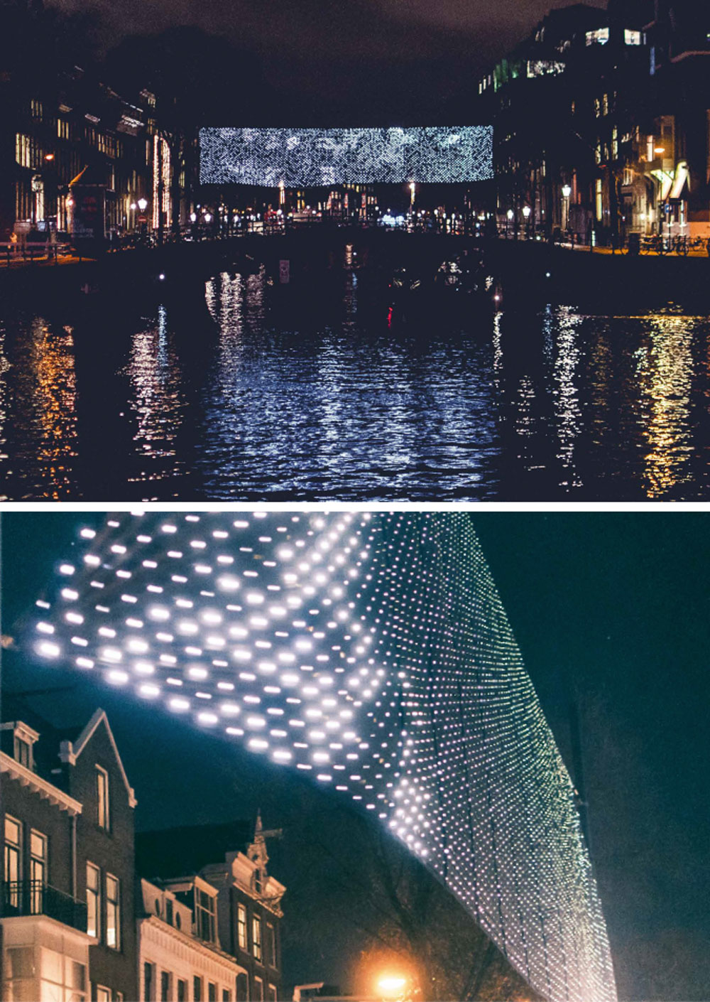 Über eine der Grachten von Amsterdam weht eine leuchtende Fahne. Während die natürlichen Kräfte des Windes das Gewebe schieben und ziehen, reagieren Tausende der integrierten LEDs auf diese Bewegung und machen die wirbelnden Luftströme in Lichtmustern sichtbar, die über dem Kanal tanzen.