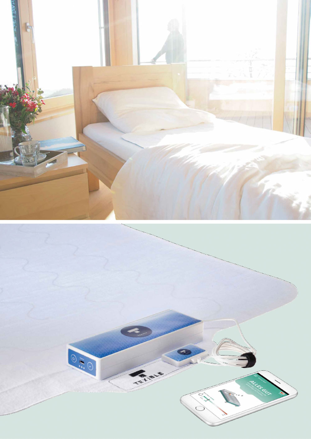 Texible Wisbi ist eine intelligente Betteinlage, die automatisch einen Alarm abgibt, sobald sich die darauf liegende Person auf einer nassen Unterlage befindet oder das Bett verlässt. Der Alarm wird über den Texible Wisbi Sender, der mit der Betteinlage verbunden ist, über eine App an die pflegende Person gesendet. Die Sensoren werden direkt in den Stoff eingestickt, sodass sie für den Nutzer nicht mehr spürbar sind. Das Sensortextil ist waschbar, schützt die Matratze vor Nässe und kann auch zeitverzögert alarmieren.
