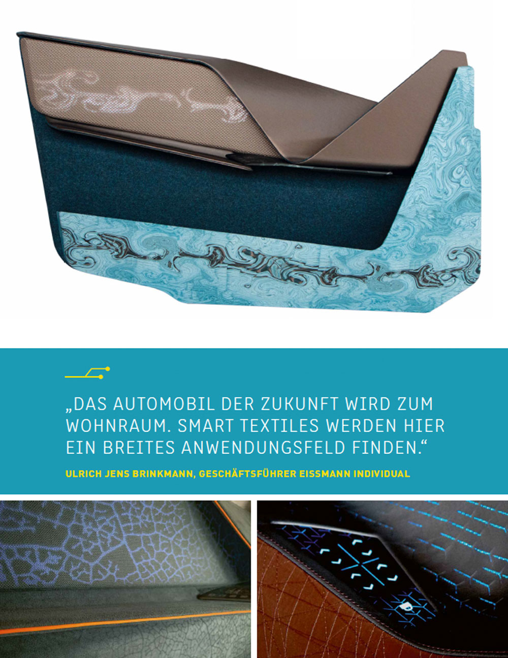 Gemeinsam mit einem exzellenten Partner-Netzwerk erzeugt Eissmann Individual durch Anwendung verschiedener Technologien sogenannte Kombinationsoberflächen. Hervoragende Ergebnisse für hinterleuchtete Komponenten im Tag- und Nachtdesign werden mit einem durchleuchtbaren Gewebe von Mattes & Ammann in Kombination mit berührungsempfindlichen Sensoren zur Steuerung des Lichtes umgesetzt. Weiteres Innovationspotenzial besteht in der Entwicklung von Stoffen, die sich farblich dem Umfeld bzw. der Stimmung anpassen, oder über Stoffe, die selbstständig erkennen, ob sie bakteriell verseucht sind und gereinigt werden müssen (z. B. via App). Parallel sind Stoffe in der Entwicklungspipeline, die es schaffen, eine hochauflösende Darstellung zu erzeugen ohne selbst ein Display zu sein (z. B. via Projektionstechnik).