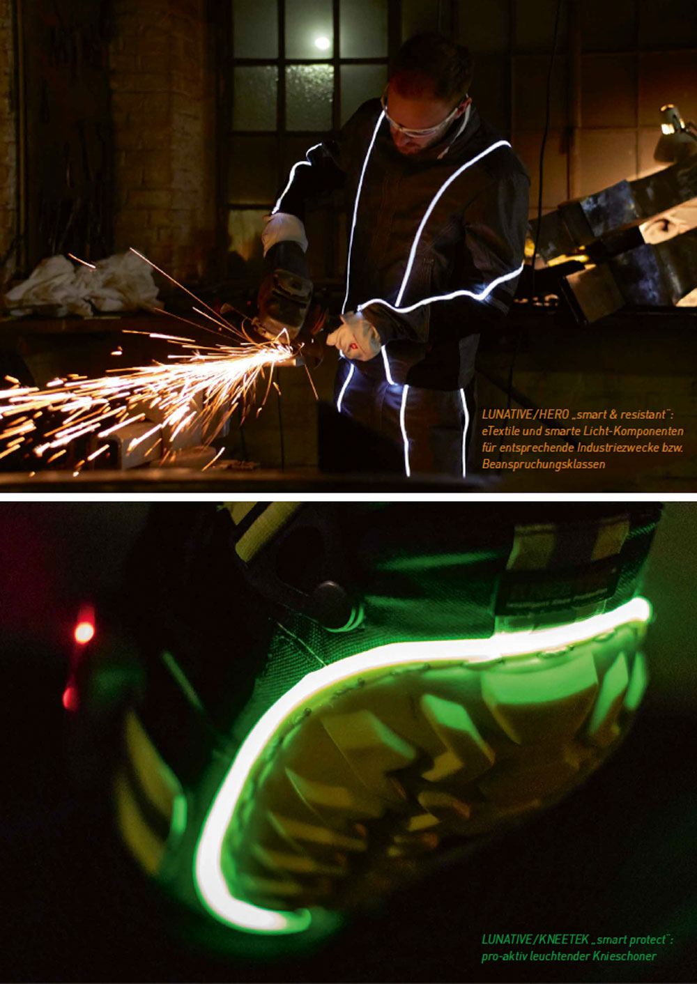 Aus Lunative „smart light“- und „smart sensor“-Komponenten werden so verschiedenste Produkte mit Lichtkommunikations-Szenarien entwickelt, die intelligent mit dem Arbeitsumfeld (human2industry/ human2tech) oder dem Menschen (human2human) selbst kommunizieren können. Beispielsweise kann die Arbeitsbekleidung dann leuchten, wenn der Mitarbeiter einen verbotenen Bereich betritt oder sich Gefahren (z. B. Gabelstapler) nähern und somit im Sinne der präventiven Unfallschutzmaßnahme eingesetzt werden. Auch Zugangskontrollen über das Textil für bestimmte Bereiche stellen einen völlig neuen Use Case dar.
