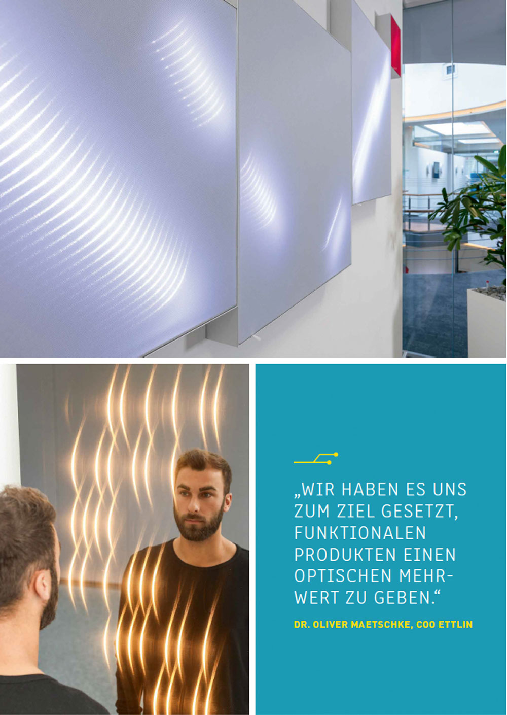 Durch Einbettung von „Licht“ in textile Gewebe realisiert die Firma FLT – Future Lighting Technologies effektvolle und funktionelle Lichtkonzepte für den Automotive Bereich und viele andere Anwendungsfelder. Der Verbau von Miniatur- und Micro-LEDs, die Hinter- und Durchleuchtung von Materialien sowie die Verarbeitung selbstleuchtender Textilien bilden dabei die Basis für viele individuelle Gestaltungsmöglichkeiten mit ambienten Lichtfunktionen und leuchtenden Funktionstextilien. Für spezielle Lichteffekte kann auch die Sticktechnik der optischen Lichtleiter eingesetzt werden. Gewünschte Schaltfunktionen werden z. B. über berührungsloses Schalten (kapazitiv sowie per Geste mit Kamartechnologie) mit im Compound eingebettet. Dabei spielt das Material – ob Kunststoff, Textil, Leder, Kunstleder, Chromleisten oder Echtholz – keine Rolle.