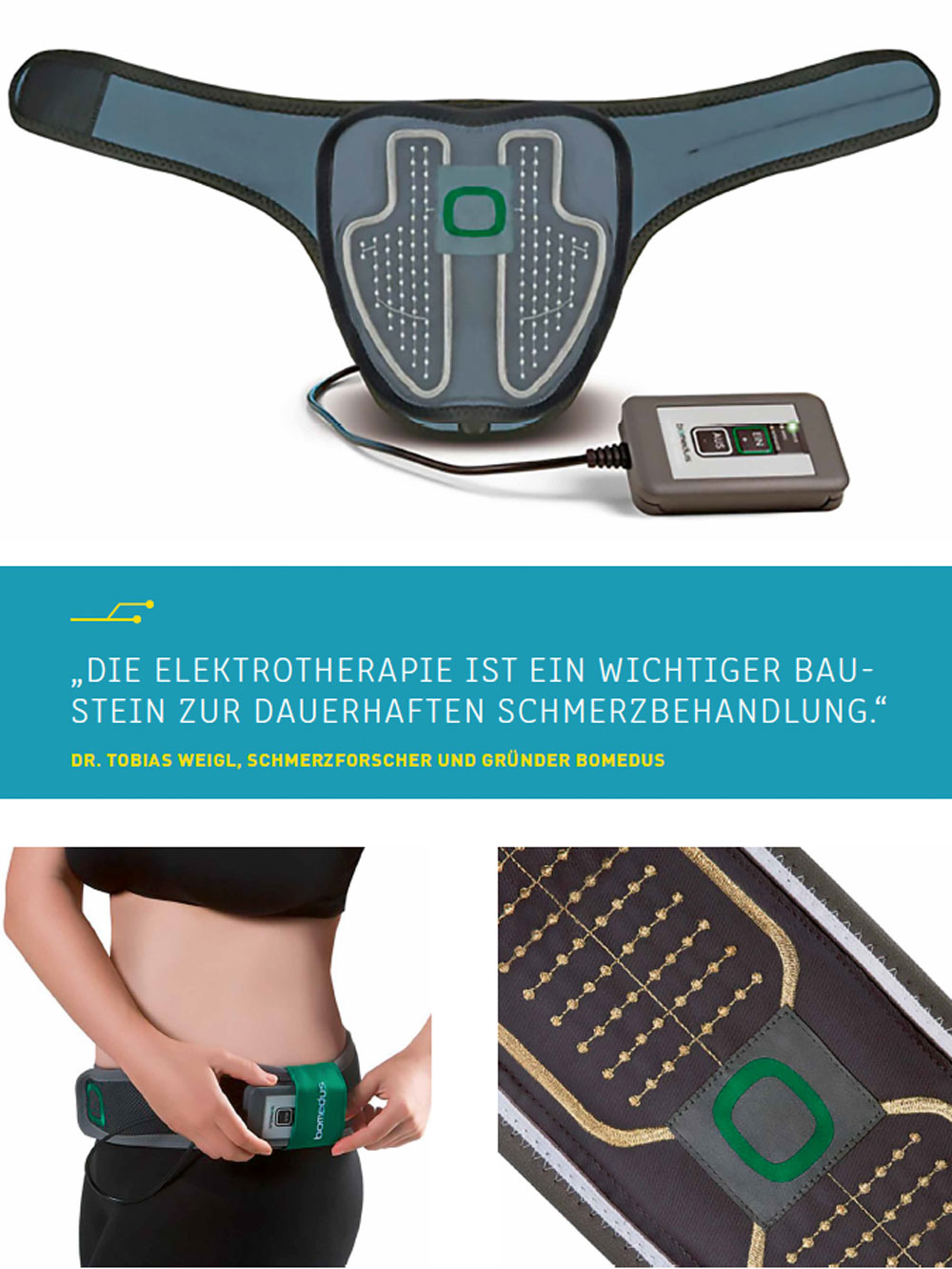 Elektrotherapie kann bei Rückenschmerzen und anderen Neuropathien, beispielsweise an Kopf, Nacken, Ellenbogen oder Knien, eine schmerzlindernde Wirkung haben und den Therapieverlauf positiv beeinflussen. Textile Schmerzbänder von Bomedus greifen diese Therapiemöglichkeit auf und behandeln Schmerzregionen durch Elektrostimulation.