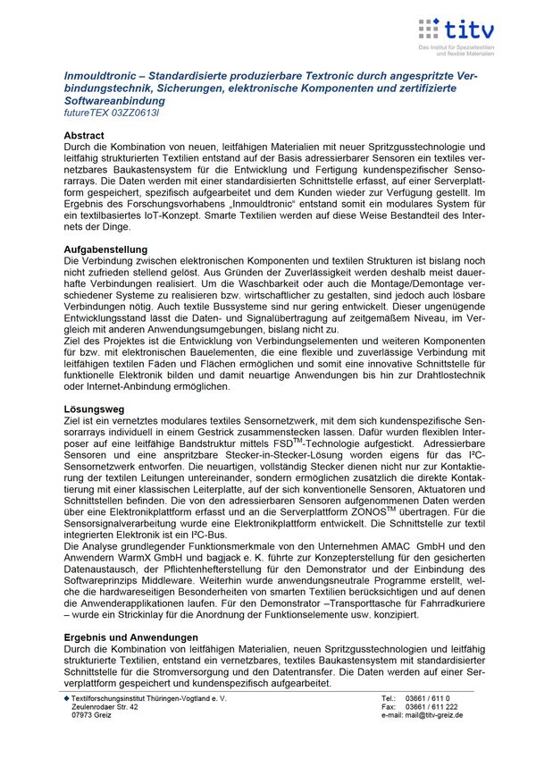 Inmouldtronic – Standardisierte produzierbare Textronic durch angespritzte Verbindungstechnik, Sicherungen, elektronische Komponenten und zertifizierte Softwareanbindung