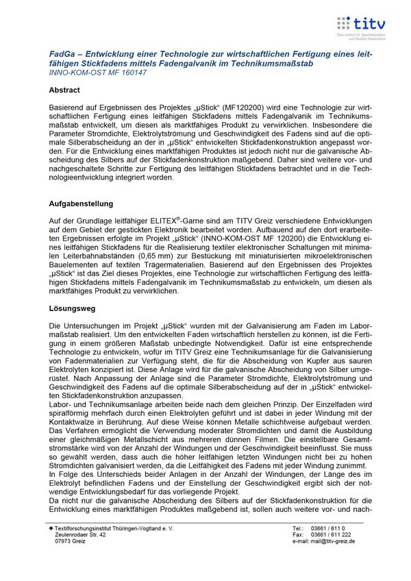 FadGa – Entwicklung einer Technologie zur wirtschaftlichen Fertigung eines leitfähigen Stickfadens mittels Fadengalvanik im Technikumsmaßstab